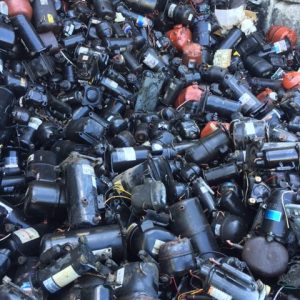 Sealed unit scrap containing compressors and mixed metals from refrigeration equipment.